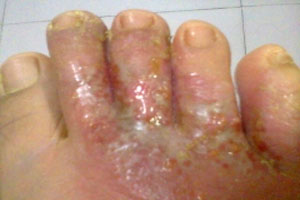 1、糜烂型:好发于第三与第四,第四与第五趾间。初起趾间潮湿,浸渍发白或起小水疱,干涸脱屑后,剥去皮屑为湿润、潮红的糜烂面,有奇痒,易继发感染。