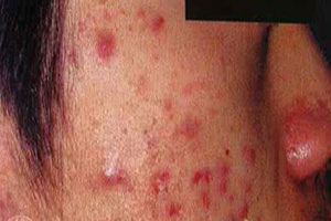 2、丘疹性痤疮症状:最常见的皮肤损害以发炎的小丘疹为主,大小有如米粒到豌豆大,较密集,有的也较坚硬,颜色是淡红色或深红色,有时在丘疹中央可以看到黑头或顶端发黑的皮脂栓。