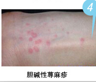 胆碱性荨麻疹:多见于23-28岁青年。皮损特点为直径1-3mm小风团,周围有红晕,疏散分布,不相融合,巨痒。