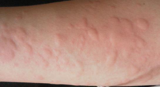 金华婺城皮肤病防治院医生指出:一般的皮肤过敏症往往起因于蚊虫叮咬或药物的副作用,其他导致皮肤过敏的过敏原还包括有毒常春藤、有毒橡木、化妆品、化学物及金属。皮肤过敏在皮肤上所产生的显著变化,如红疹、荨麻疹、发痒、肿胀、起水泡等症状,都极易留下疤痕。部分情形如昆虫叮咬所产生的过敏现象尤其危险,患者可能会在被叮咬的10~20分钟后发生过敏性休克情形,除非立刻急救,否则这类过敏情形也会导致死亡。